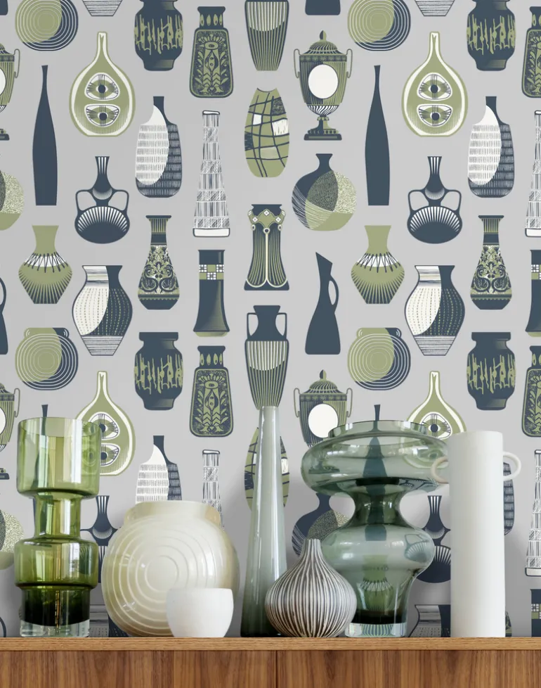 An eclectic array of vases and jugs adorns this wallpaper, inspired by the Geffrye’s diverse ceramics collection.
