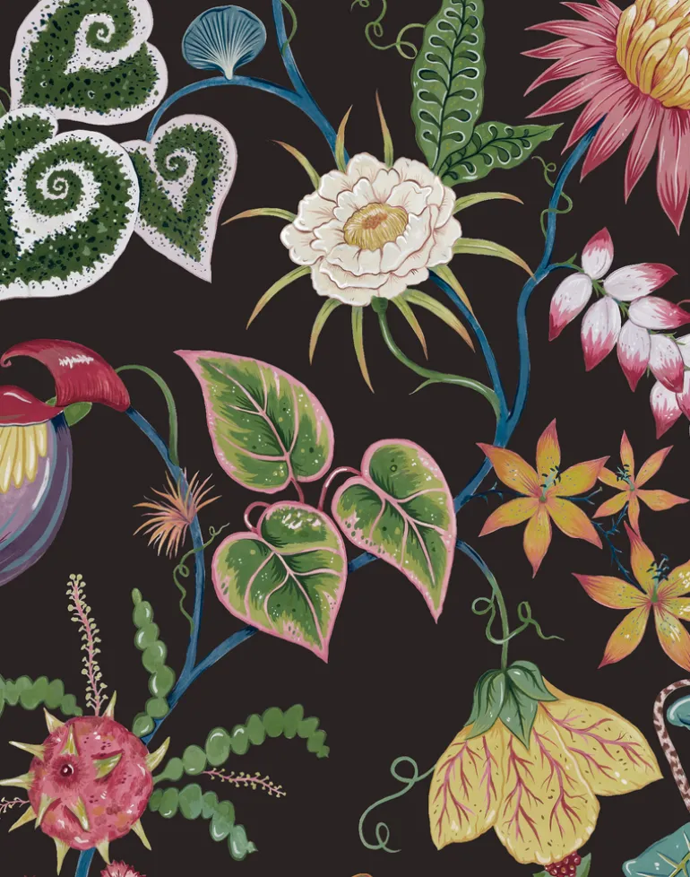 Vida Obsidian Black Wallpaper. Vida is our incredible Costa Rican inspired floral print. Showcasing the unique bio-diverse flora and foliage this incredible country has to offer. Featuring large scale, weird and wonderful specimens of blooms including banana blossoms, dragon fruits and shampoo flowers. This gorgeous Obsidian Black colorway really allows the natural colors of the foreground fauna to sing. This palette inspired by an Obsidian gemstone which spiritually is known to promote protection, fulfilment and manifestation.