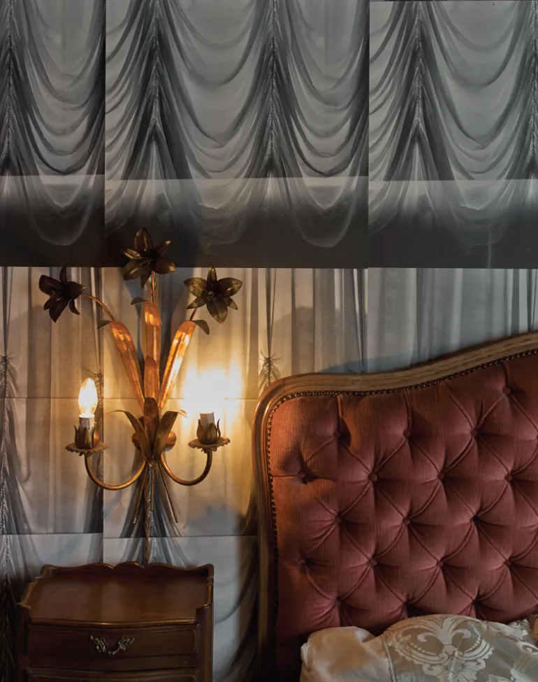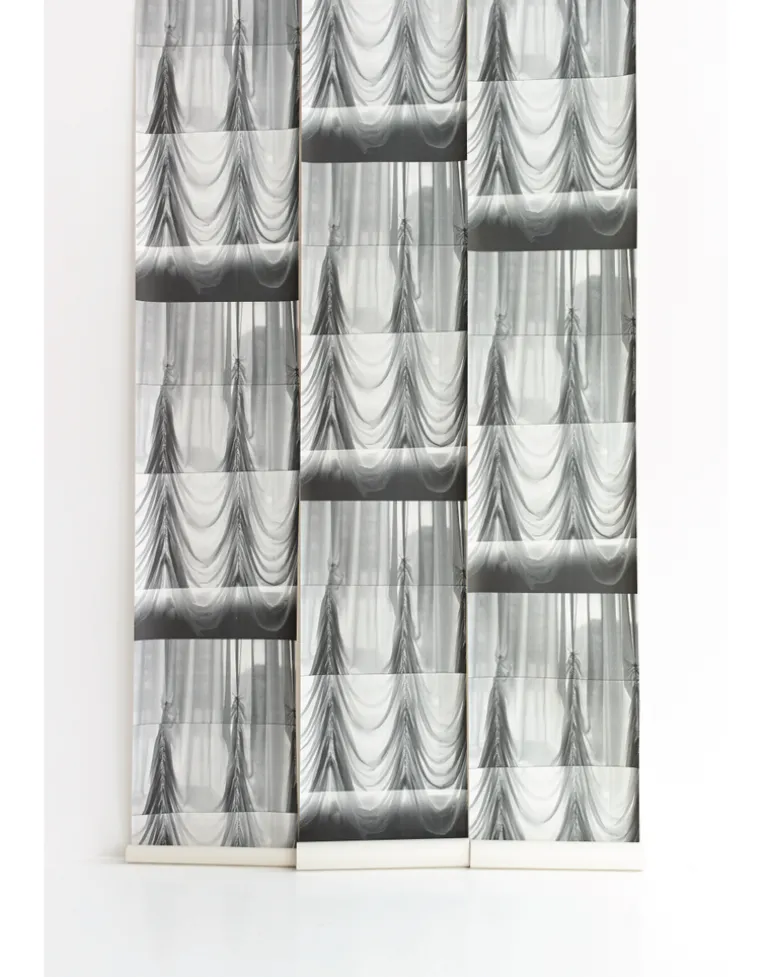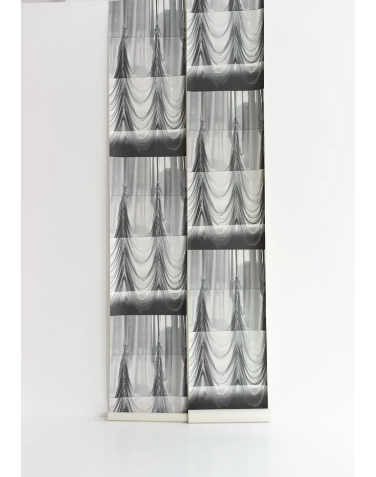 Deborah has produced an extensive range of individual, non-repeat wallpaper designs. These began with her graduation installation of ‘Hooks & Frocks’ which incorporates photographs of hanging dresses, montaged together and then machine printed at life-size onto drops of wallpaper. The monochrome images are brought to life by adding silkscreened color and hand painted detail, creating a homage to trompe l’oeil and deliberately shunning the repeat pattern. Deborah’s intention is for her work to interact quietly and playfully with objects and furniture, but not dominate the surrounding environment.