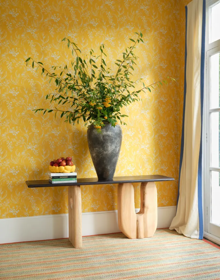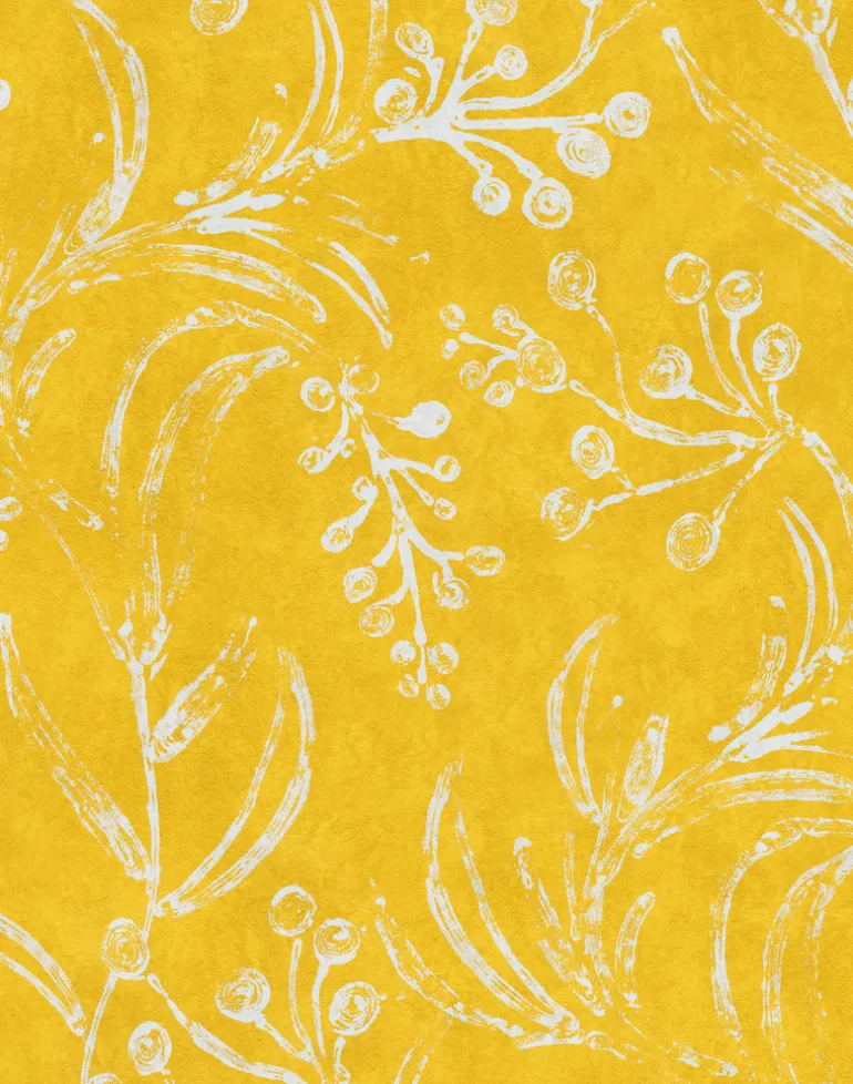 Part of our MINNIE KEMP X MINDTHEGAP Collection, WALLFLOWER is inspired by a hand-rolled wallpaper found on the kitchen walls of a 15th-century Transylvanian Manor. The design, printed with hand-carved blocks, features trailing leaves and buds on a painterly colorful background. This enchanting design is available in six different colorways: Sunny, Clementine, Raspberry, Sky, Moss and Splash.