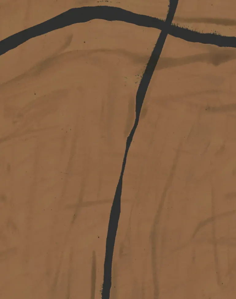 A painted background of earthy hues reveals lines weaving up, down, and across the surface.