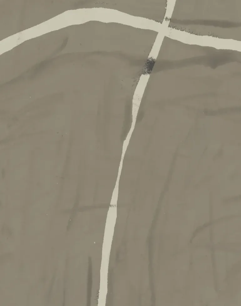 A painted background of earthy hues reveals lines weaving up, down, and across the surface.