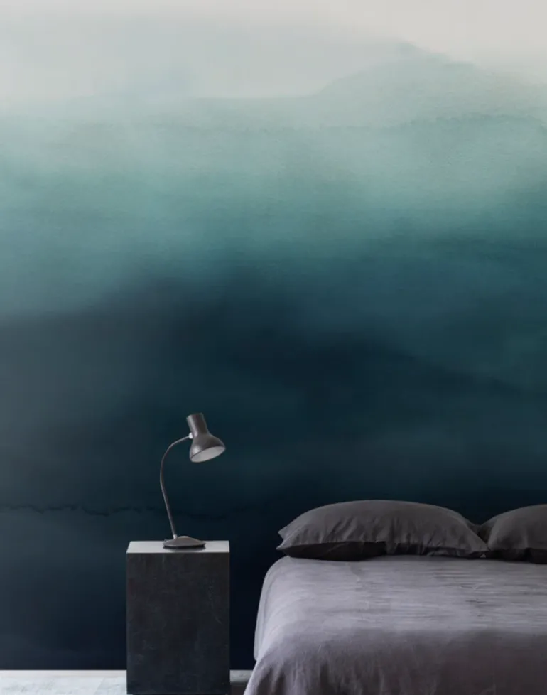 Layers of hand-painted watercolor flow across the paper, designed to bring restfulness to a room, adding a delicate and decorative touch.