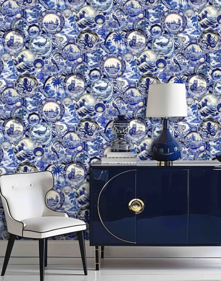 This maximalist wallpaper showcases a collection of ceramic plates. This bold design features mythical creatures, from graceful cats and majestic tigers to gentle whales, elegant birds, and elusive octopuses. This vibrant wallpaper with its sophisticated plate design is all you need to create a sensational living room feature wall.