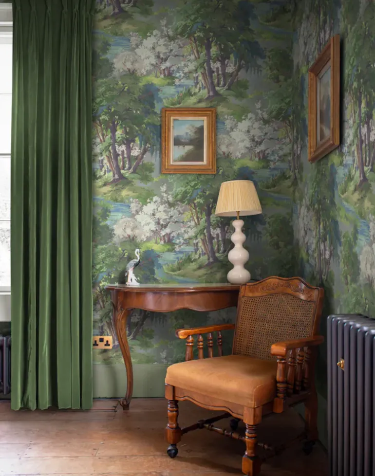 With a calming color palette of soft greens, blues and pinks, we love using this as a bedroom wallpaper to bring the wonder of nature into your space.