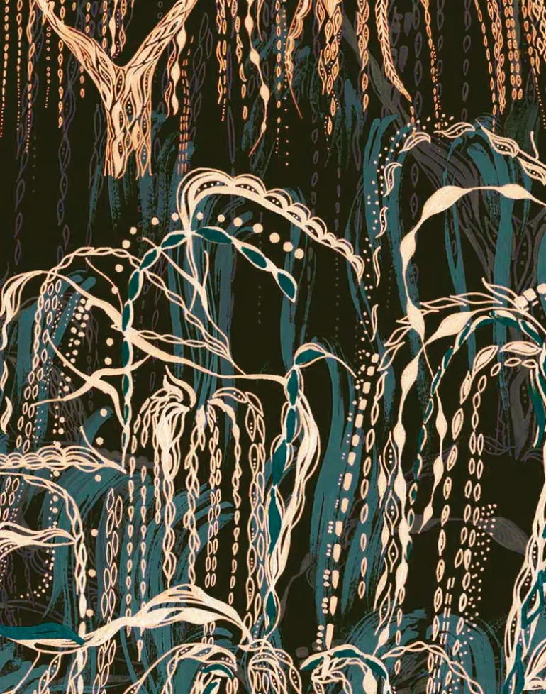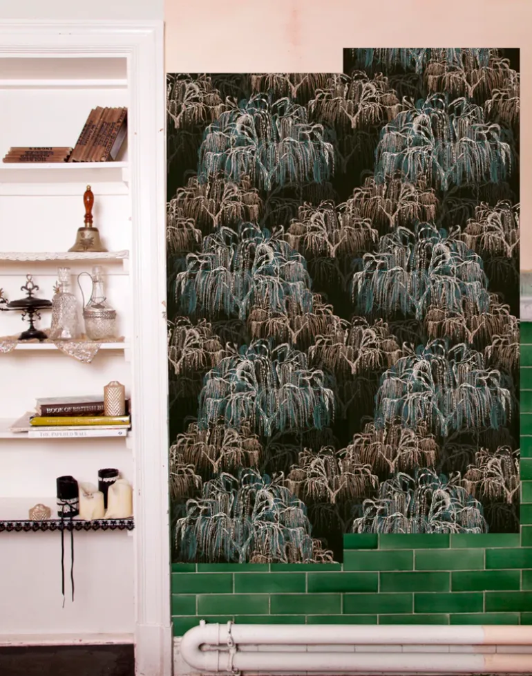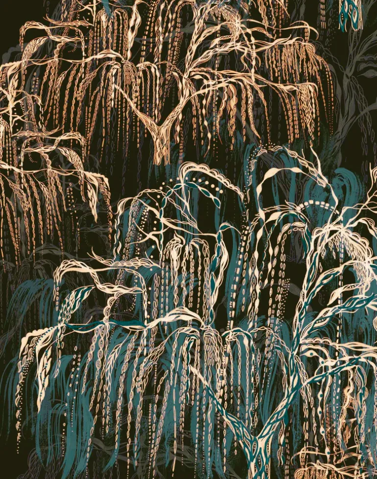 Digitally printed wallpaper featuring an elegant hand drawn willow tree in repeat.