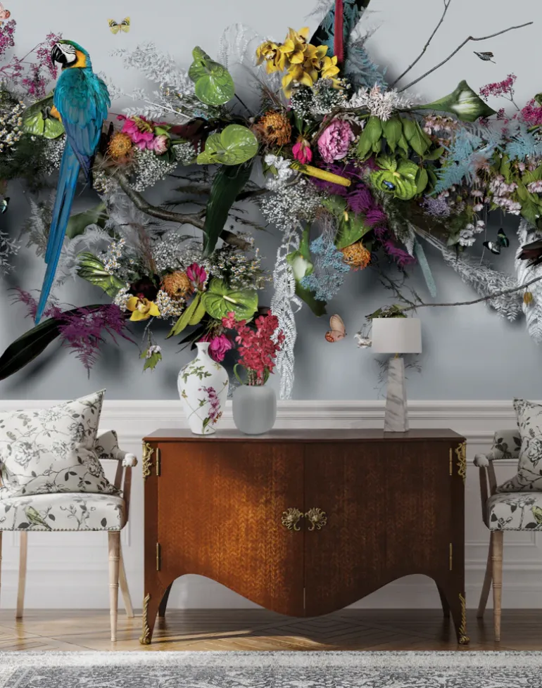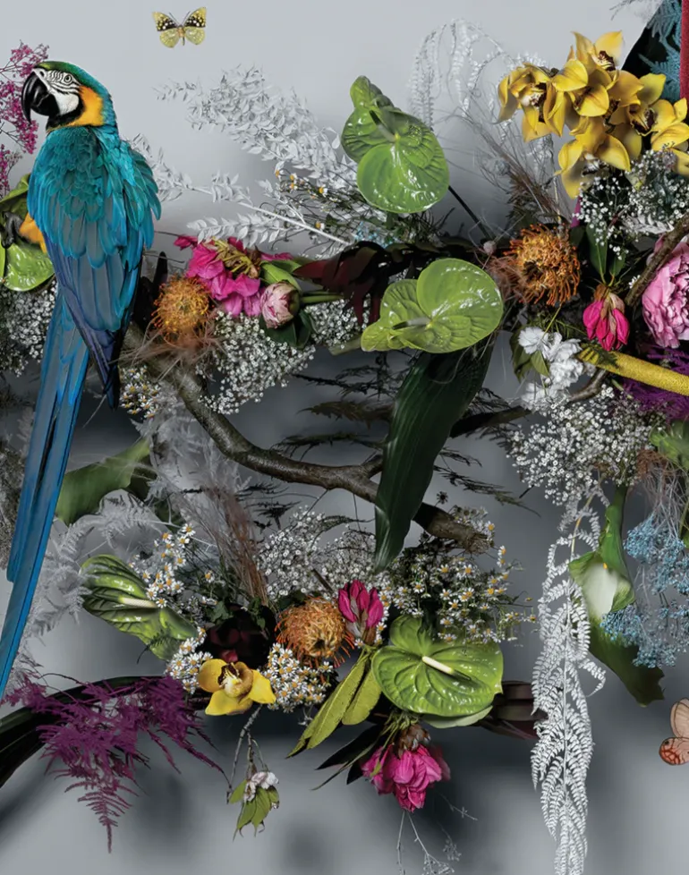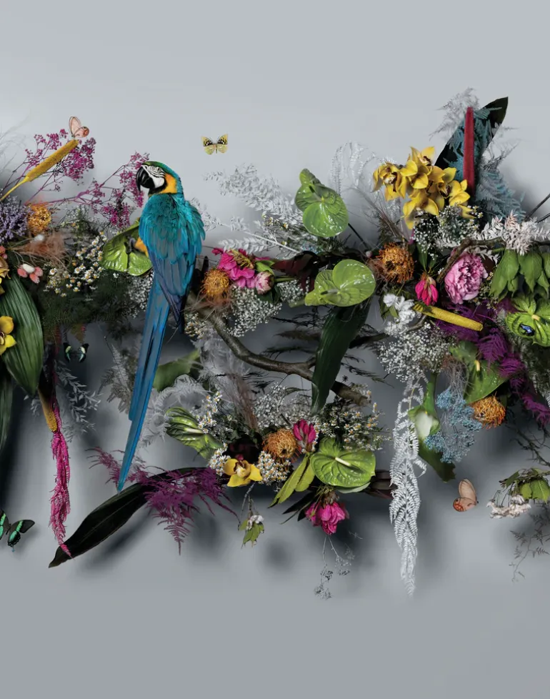Wedgwood & Feathr have collaborated with multi-disciplinary British contemporary artist Claire Luxton to create an original artwork inspired by six patterns introduced to the Wonderlust teaware collection. Luxton reimagined the new Wedgwood patterns with a living sculptural installation visualized in the artist’s East Sussex studio. Using florals, botanicals, taxidermy and live animals, Luxton created a multi dimensional installation involving sculptural, collage, photographic and hand painted techniques. The finished three dimensional sculpture was photographed in over thirty different sections by Luxton who then digitally stitched the artwork together in hundreds of layers before applying hand finished details, including water droplets and images of real life poison dart frogs.
