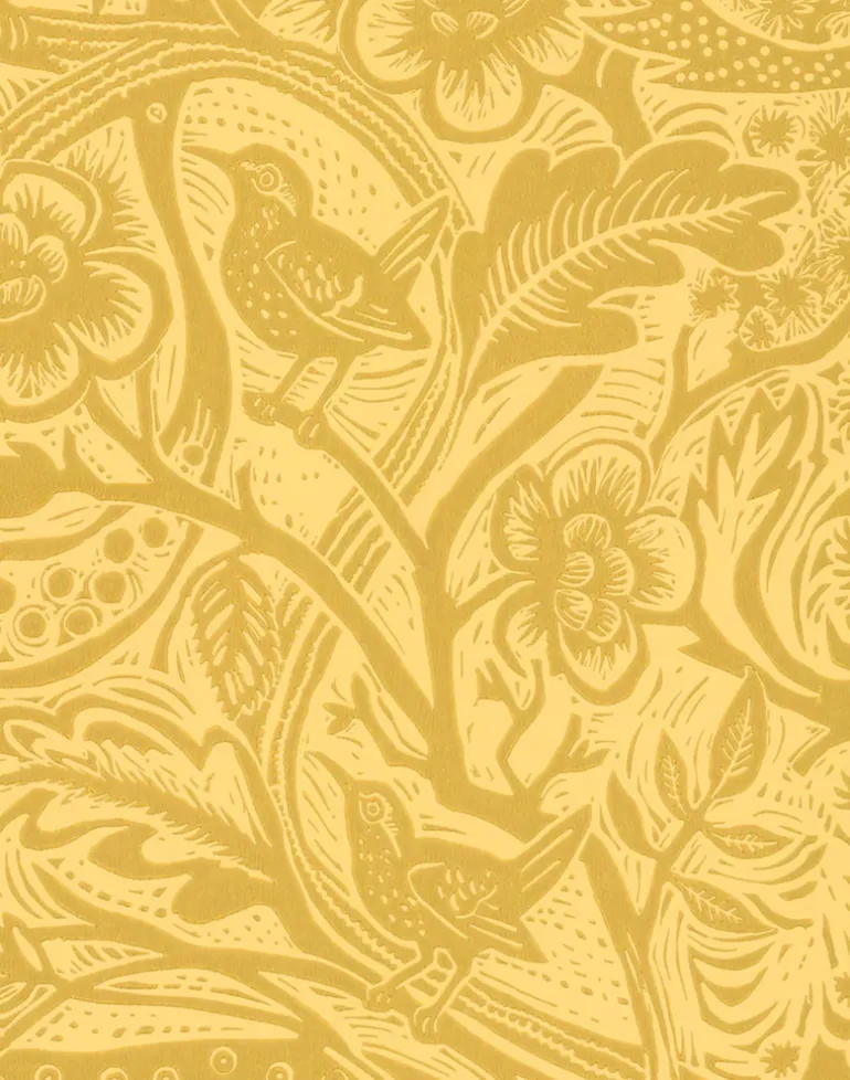“I cut the lino block for ‘Wren’ after a trip to Paris – inspired in part by the wonderfully flamboyant patterns found in ‘Papiers Dominotés Français’ from the eighteenth century. The combination of natural forms and decorative arabesques is full of brio and elan. In my repeat pattern, the serpentine movement of ribbon and plant stems is punctuated with birds that perch and peck from within the verdure.”
