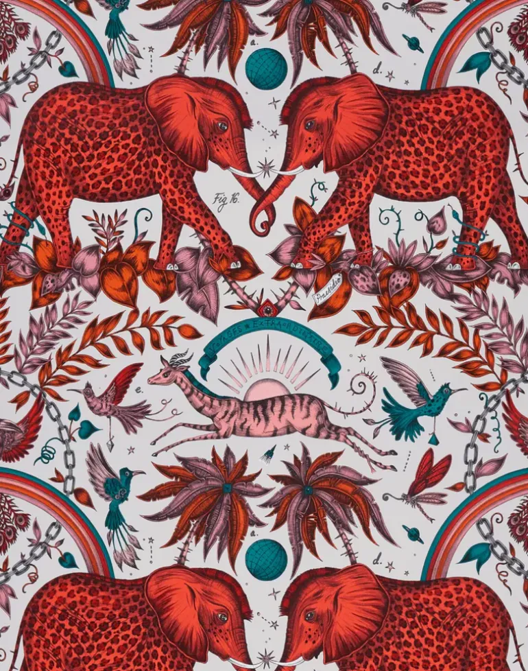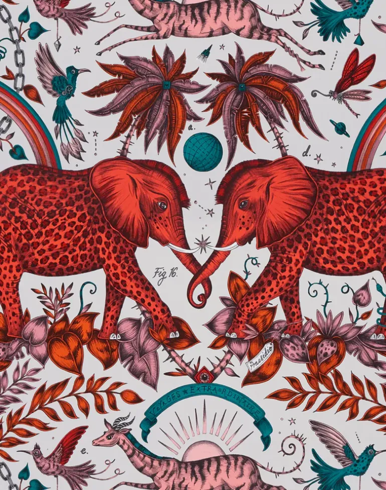 The Zambezi Wallpaper will transport you to a fantasy jungle. Striking leopard-spotted elephants take center stage, inspired by Jules Verne`s adventure stories and Emma`s travels to Botswana. Leaping gazelles, birds of paradise and curious foliage also feature in this explosion of African magic. Creating a striking focal point in any interior with rich with golden metallic foliage, rainbows and leopard print that glints and shimmers when the light hits it, contrasted by charcoal greys and an off-white background. Lose yourself in the imaginative detail of this stunning wallpaper, guaranteed to transform your interior into a dream world.