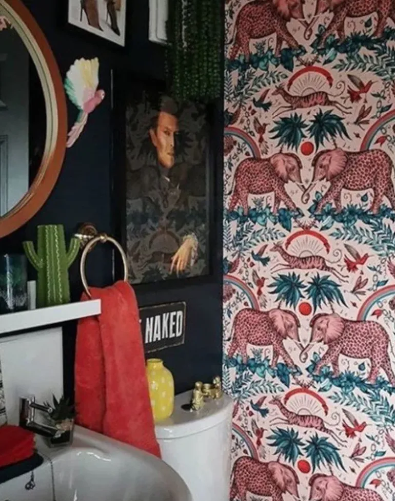 The Zambezi Wallpaper will transport you to a fantasy jungle. Striking leopard-spotted elephants take center stage, inspired by Jules Verne`s adventure stories and Emma`s travels to Botswana. Leaping gazelles, birds of paradise and curious foliage also feature in this explosion of African magic. Creating a striking focal point in any interior with rich with golden metallic foliage, rainbows and leopard print that glints and shimmers when the light hits it, contrasted by charcoal greys and an off-white background. Lose yourself in the imaginative detail of this stunning wallpaper, guaranteed to transform your interior into a dream world.