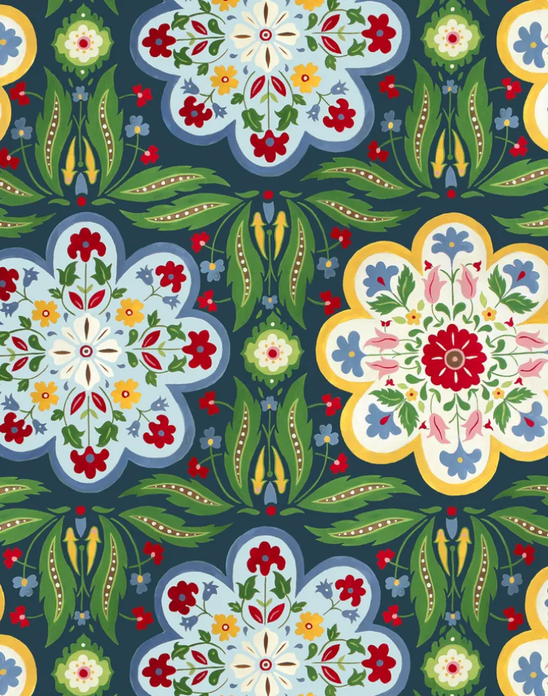 Our Zouak Wallpaper in Midnight is a gorgeous geometric style print inspired by the beautiful painted ceilings of the Bahia Palace in Morocco. Our print pays homage to the craftmanship and skill of zouak, the name given to the traditional art of decorative wood painting. The compositions would emphasize symmetry and repetition giving a sense of depth and grandeur. Colored on a deep inky backdrop that captures the mystique of the night sky and enriched with exotic primary tones reminiscent of the city’s culture and artistry.