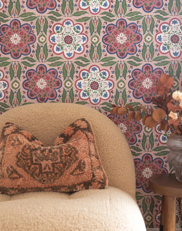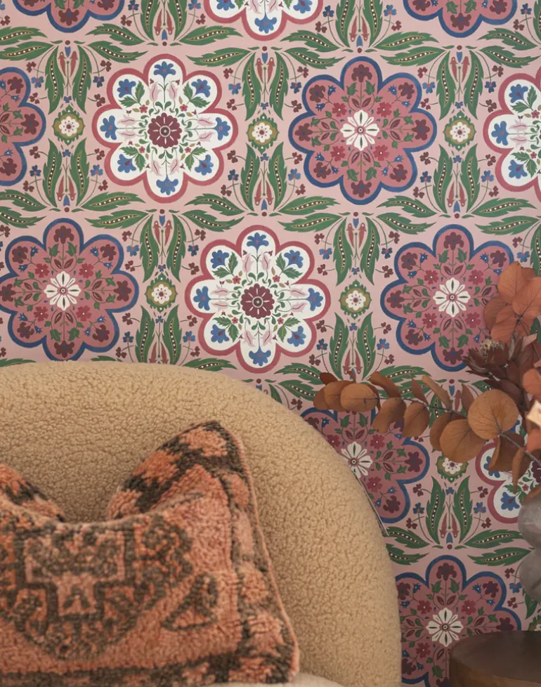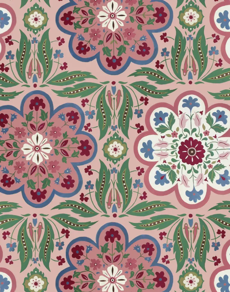 Our Zouak Wallpaper in Old Rose is a gorgeous geometric style print inspired by the beautiful painted ceilings of the Bahia Palace in Morocco. Our print pays homage to the craftmanship and skill of zouak, the name given to the traditional art of decorative wood painting. The compositions would emphasize symmetry and repetition giving a sense of depth and grandeur. Colored in warm dusty pinks reminiscent of the city’s sun drenched walls. This shade feels both grounded and and luxurious with a timeless appeal tied to Morocco’s artistic heritage.