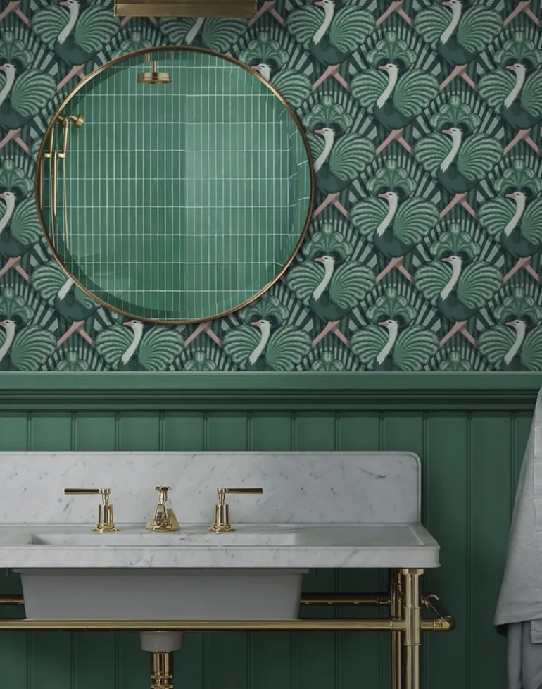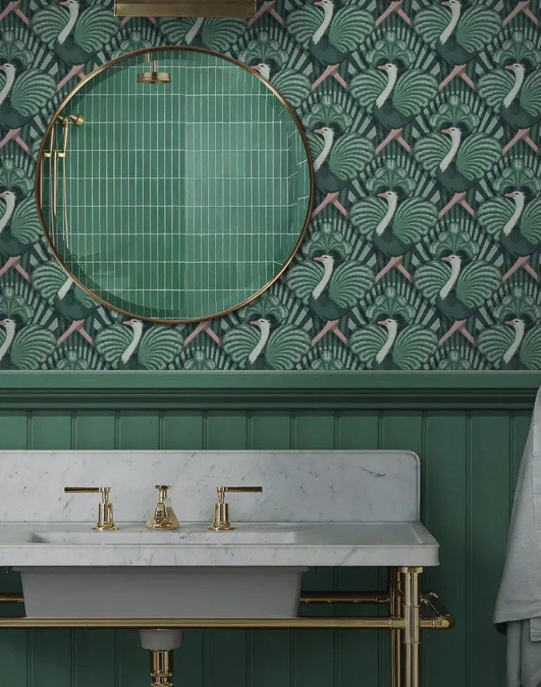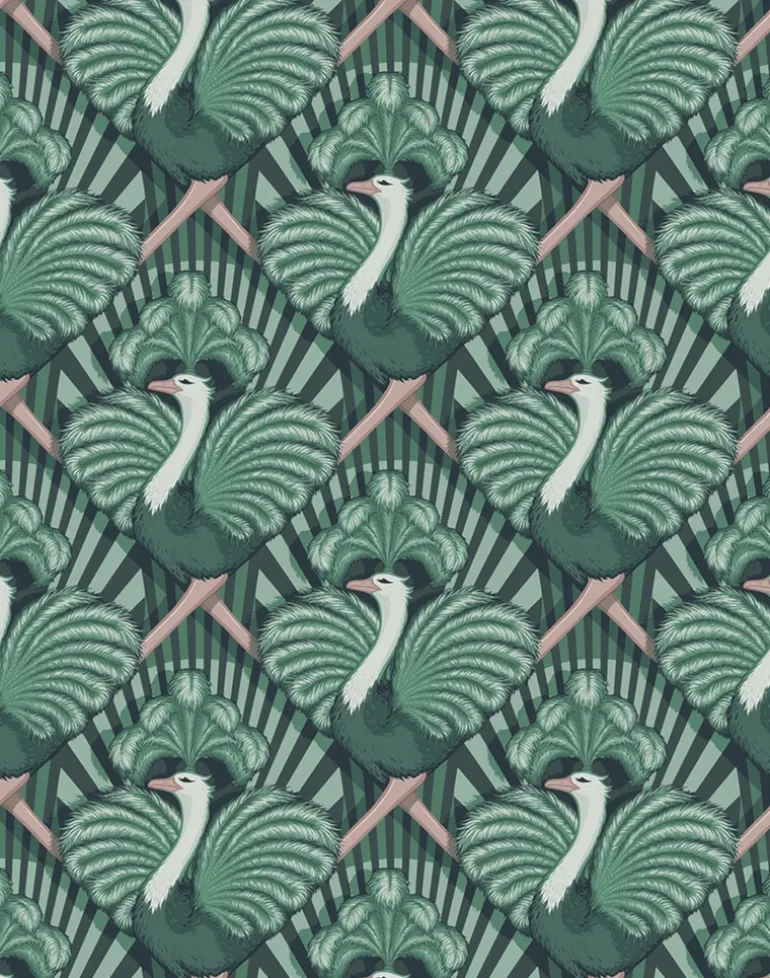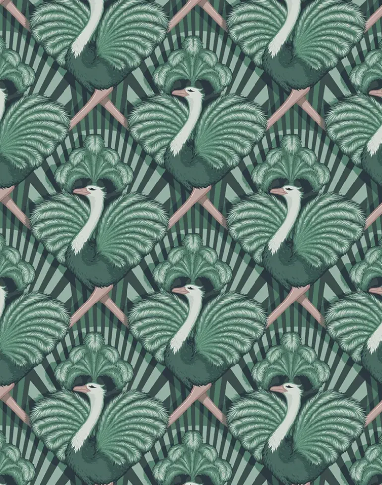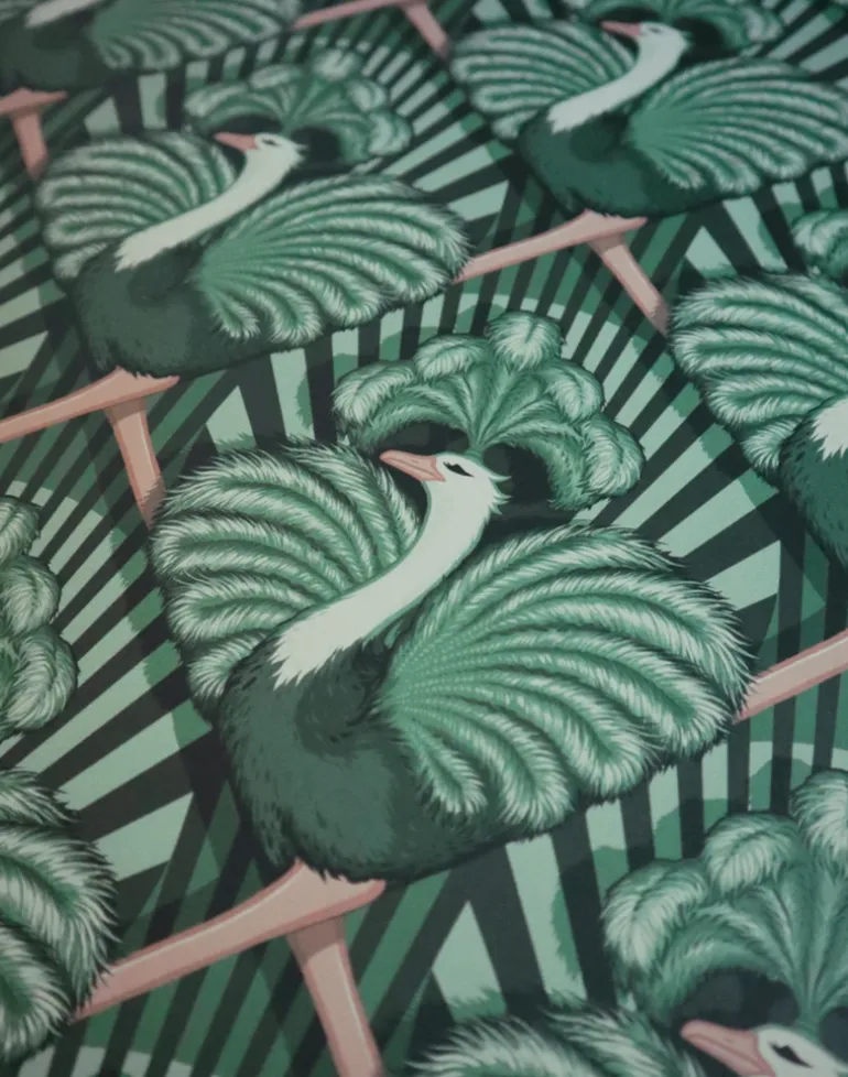 A stunningly flamboyant design that conjures the Golden Age of Hollywood and the iconic motion pictures of Fred Astaire and Ginger Rogers. Our glorious ostrich showgirls display their beautiful feathers as they dance across the stage in glorious Technicolor formation.
